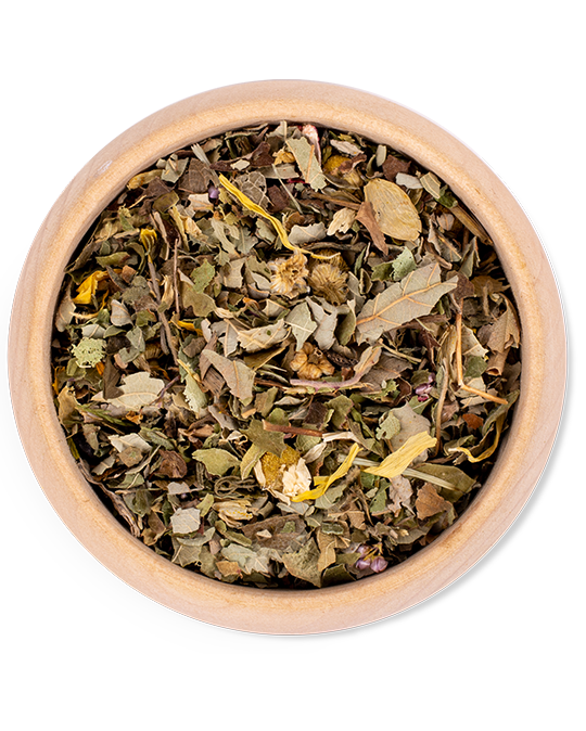 Brombeerblätter, Kamillenblüten, Erdbeerblätter, Pfefferminzkraut, Heidelbeerblätter, Melissenkraut, Hibiskusblüten, Lindenblüten, Anis, Birkenblätter, Ringelblumenblüten, Heidekraut, Fenchel, Hopfen.